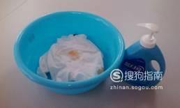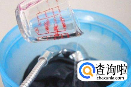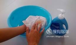 将衣服拧干放入盆中,污渍部位贴盆底,用瓶盖量取一些洗洁精倒在污渍处,使污渍部分再次浸湿。
