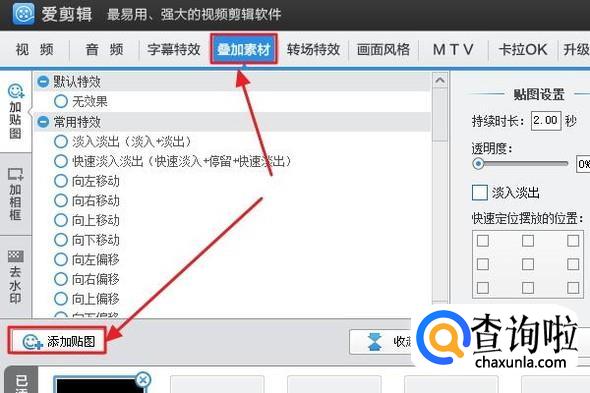 由于该视频里面没有任何内容,所以接下来我们将照片添加到里面即可制作成我们需要的视频了,那么如何添加照片呢?我们将选项切换到“叠加素材”-“添加贴图”,如图;