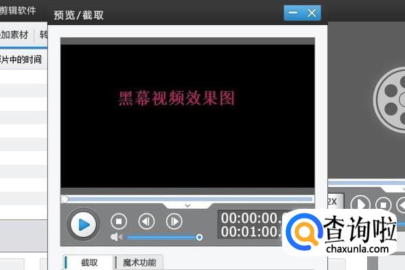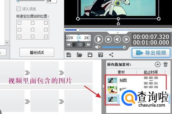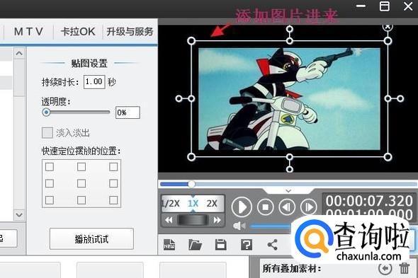 在右侧的视频预览窗口,我们手动拖动播放进度条,然后按照以上的添加贴图方法,就可以给这段黑幕视频添加各种各样的图片了,不过最大时长只有1分钟,如果还想添加时长较长的,就要下载新的黑幕视频了;