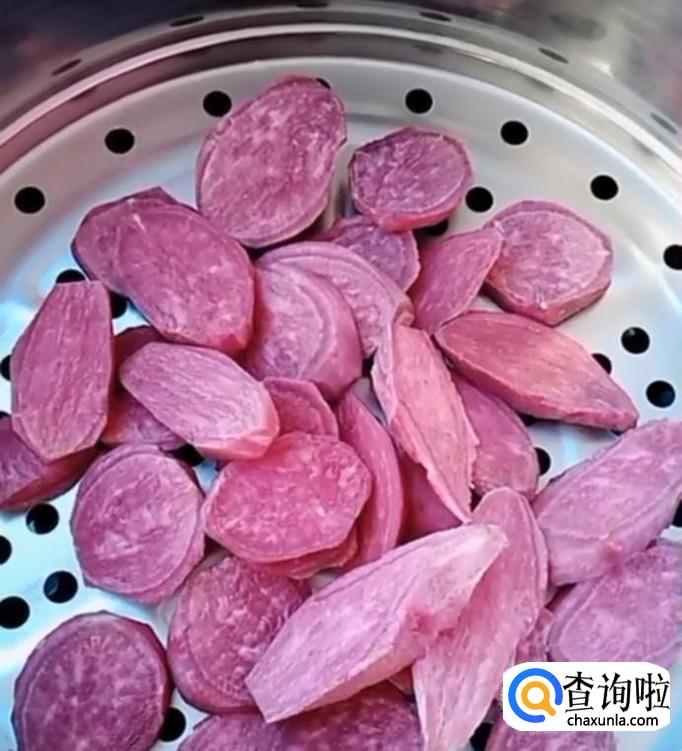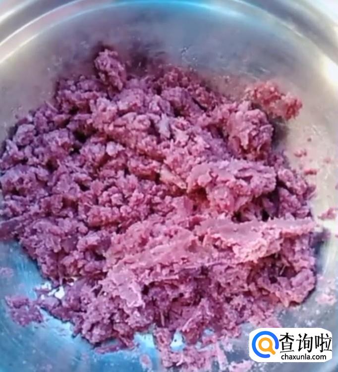 将紫薯洗净,去皮,上锅蒸熟,趁热加入白砂糖,捣成泥,备用。注意,一定要趁热捣,这样才更容易捣成均匀的泥状。