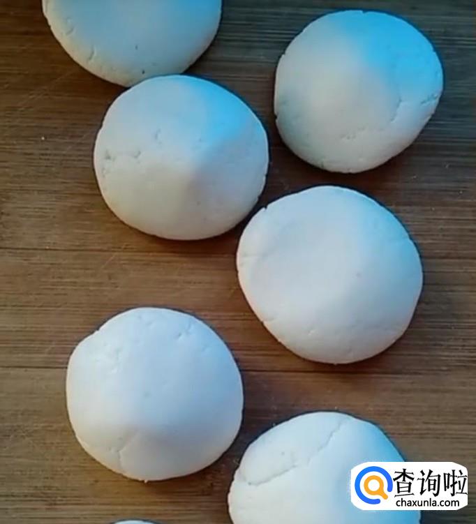 将面团分成剂子。将小剂子揉成圆形的。再用擀面杖将小剂子擀成片儿。