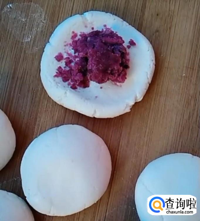 将擀好的片儿内,包上做好的紫薯泥,用手捏好口儿,压平。