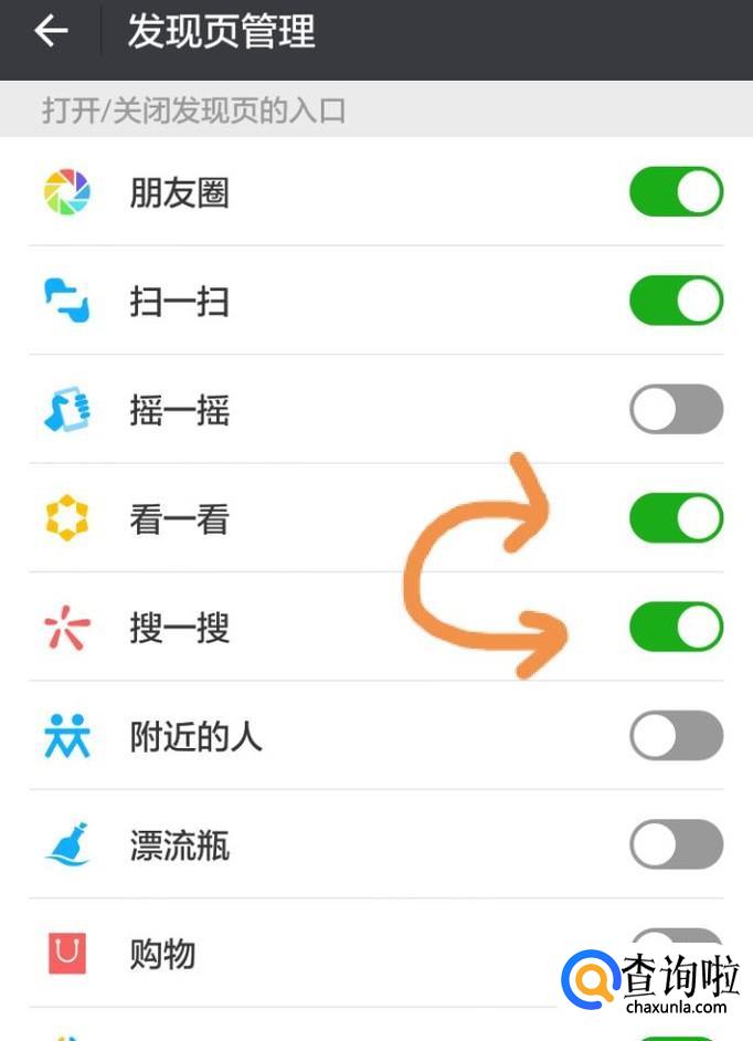 找到“搜一搜”和“看一看”两个功能,滑动右边的图标,图标变成绿色就是启用了这两个功能
