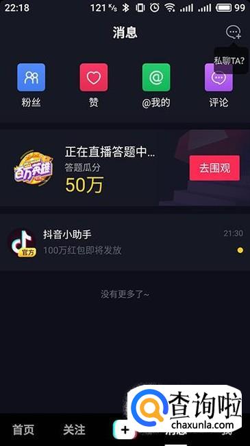 在“消息”界面,如果有新的人关注到自己的话,点击“粉丝”即可看到关注自己的人。