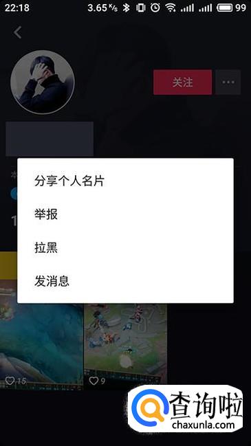 点击“三点”即是更多,可以进行分享、举报、拉黑等操作。