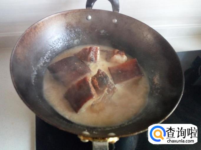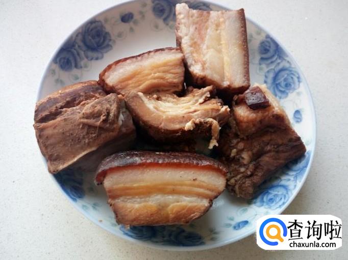腊肉用清水洗净,放入锅内煮一下,大概煮四十分钟左右,煮好后装盘备用(这些腊肉可不全是用来蒸白菜的)。