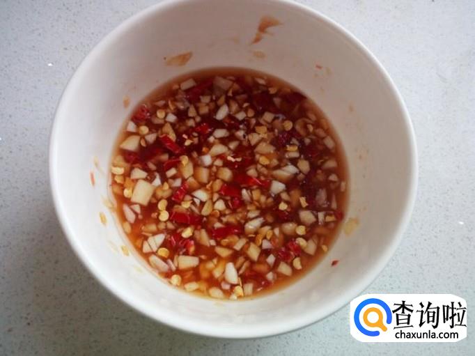 把蒜末,红干椒丝,混合在一起,放入白糖,耗油,少量水,调成料汁。