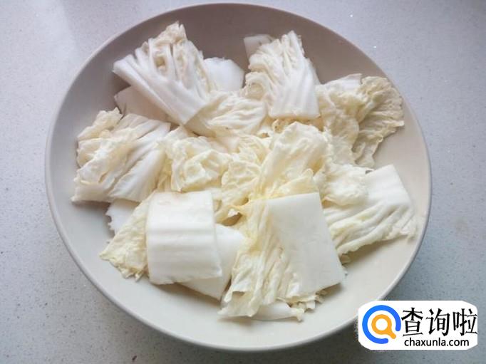 大白菜用水洗净,切成大约长5公分,宽3公分的块,摆放盘中。
