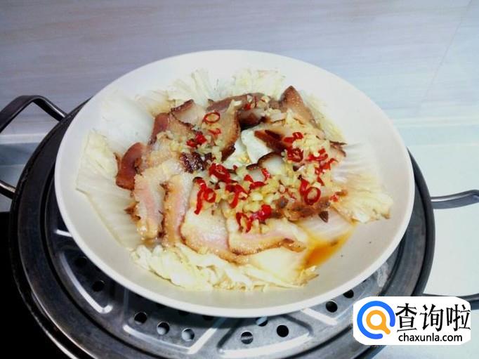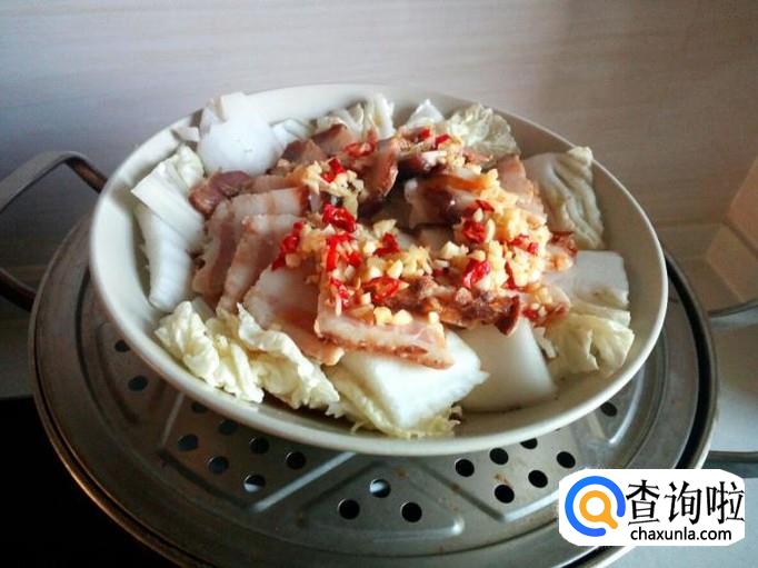 把调好的料汁浇在白菜腊肉上,然后上锅蒸。
