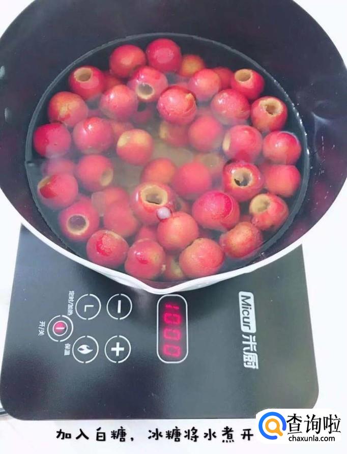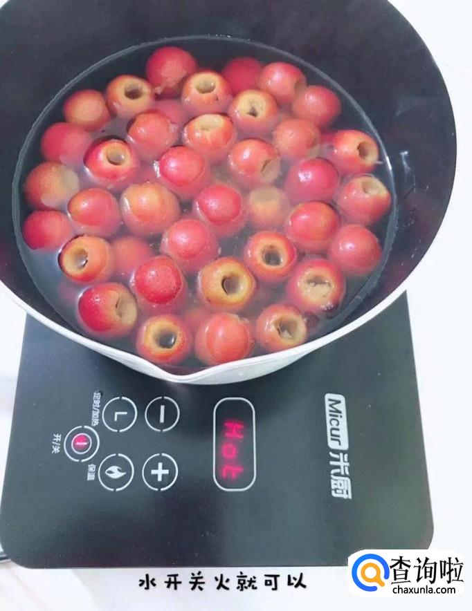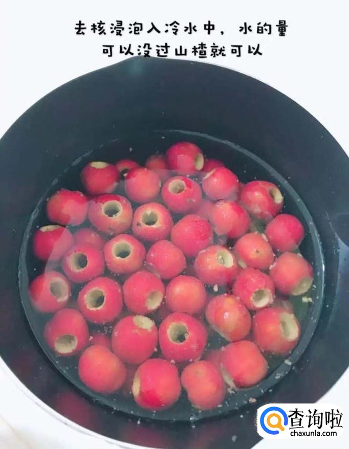 接着把山楂去核,锅中放入正漫过山楂的水量,如下图所示。
