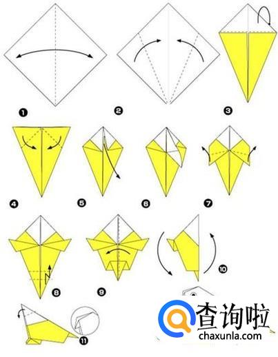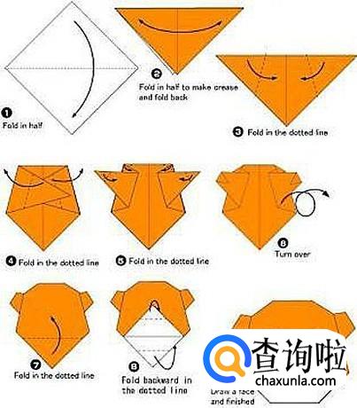下图是小狗的折法,快照着步骤跟孩子一起折一只吧。