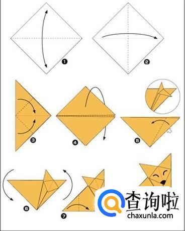 下图是可爱的小狐狸折法图解,记得用笔画上狐狸的嘴巴和眼睛。