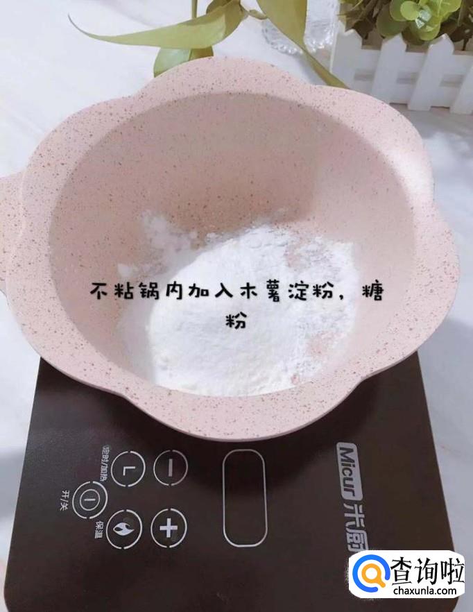 接着在不粘锅中加入木薯淀粉和糖粉,如下图所示。