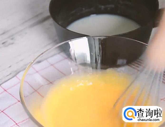 打四个鸡蛋,倒入牛奶,不停地搅拌,使其充分混合。