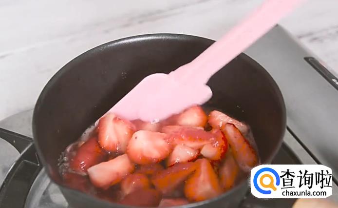 将草莓和糖的混合物加入锅中,用文火慢慢熬煮。