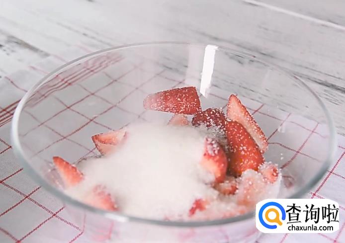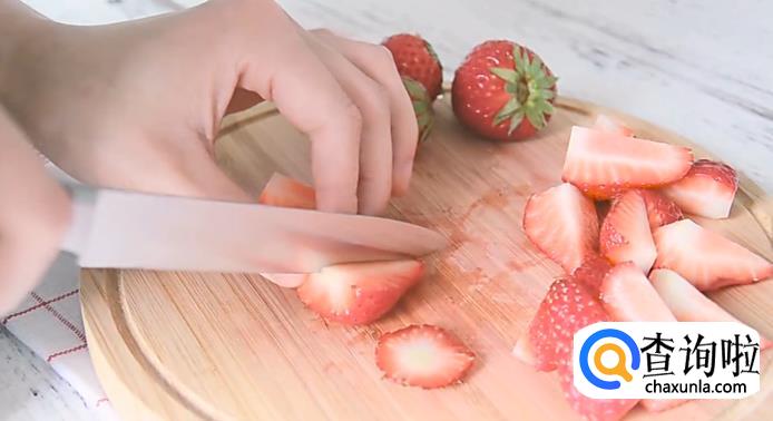 选取新鲜的草莓十颗,切成较小的块,放入碗中。也可以根据自己口味选取其他的水果。