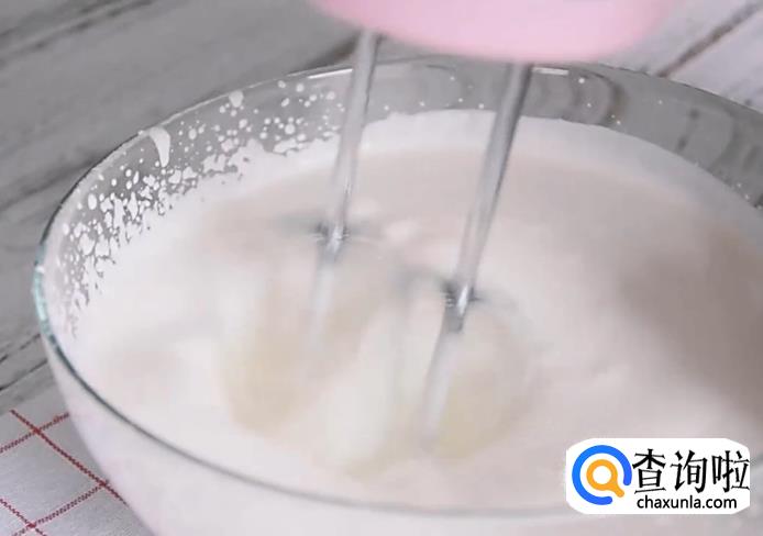在大碗里加入半碗淡奶油,用搅拌器搅拌,直至淡奶油呈现出泡沫状。