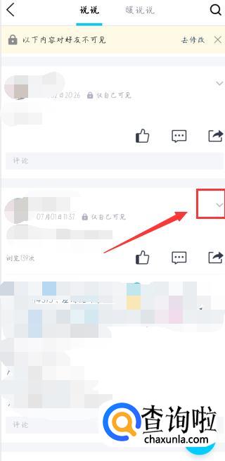 在新弹出来的界面中就可以看到自己发布过的所有说说,然后找到要删除的那条说说,点击那条说说的右上角,如下图所示。