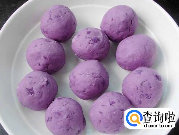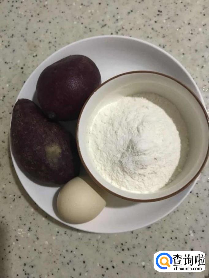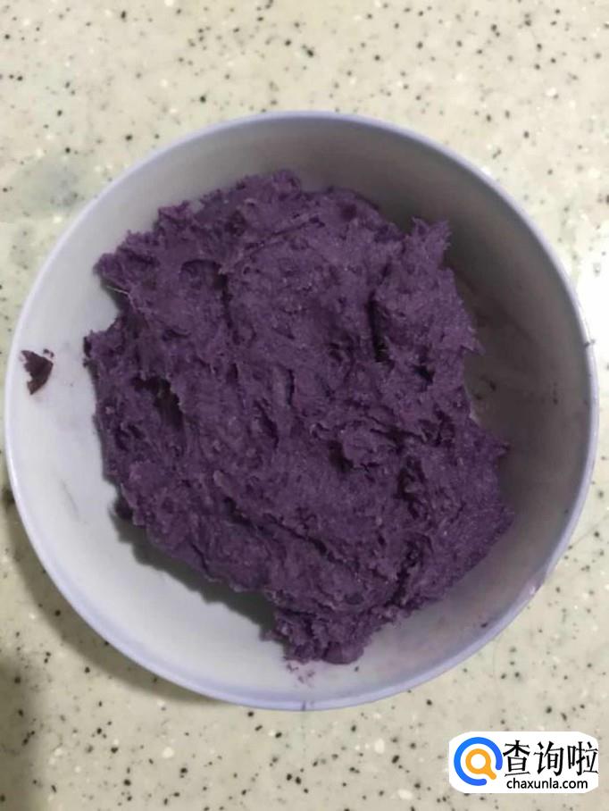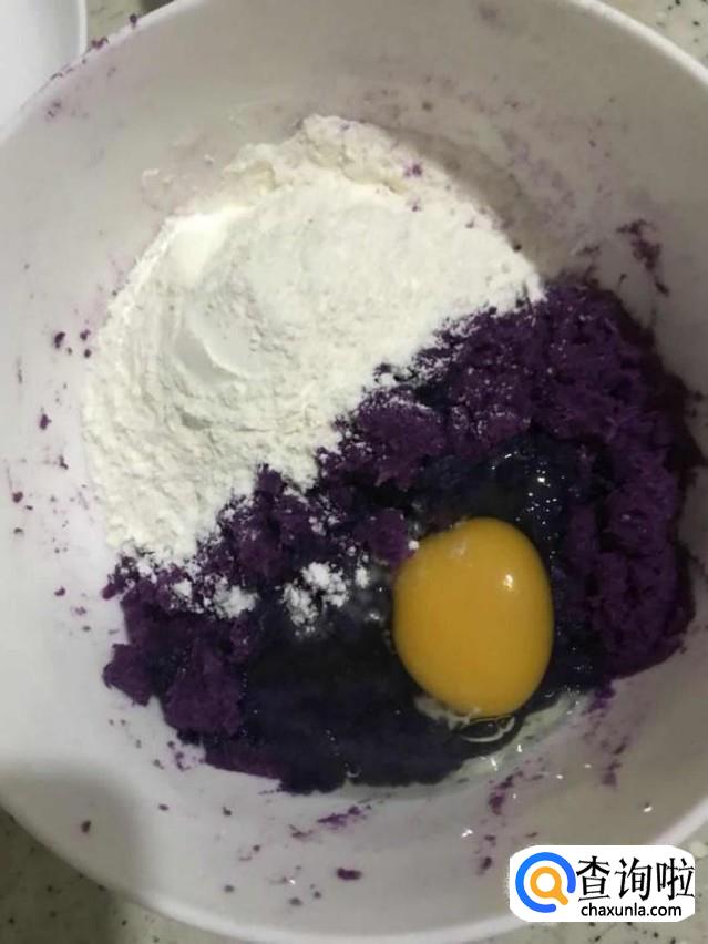 第三步:将蒸烂的紫薯捣碎。在已经冷却的紫薯泥中加入准备好的面粉,并打入鸡蛋。(要等到紫薯冷了加面粉和鸡蛋效果更好哦!)
