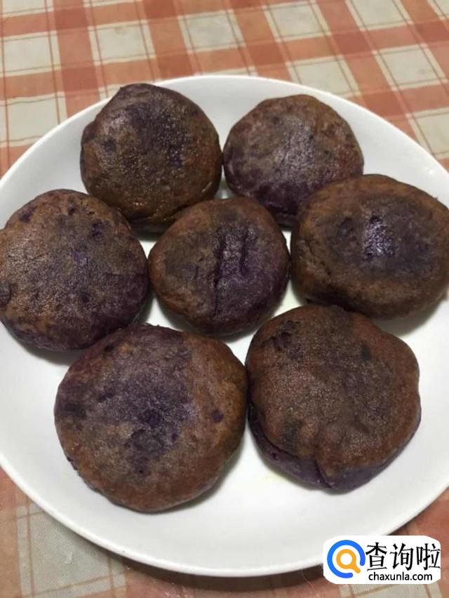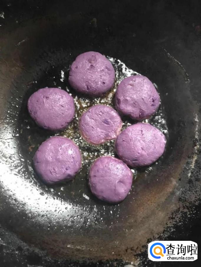 第七步:将捏好的紫薯饼放入锅内油中,煎至两面金黄即可出锅罗!(煎的时候记得翻边哦!)