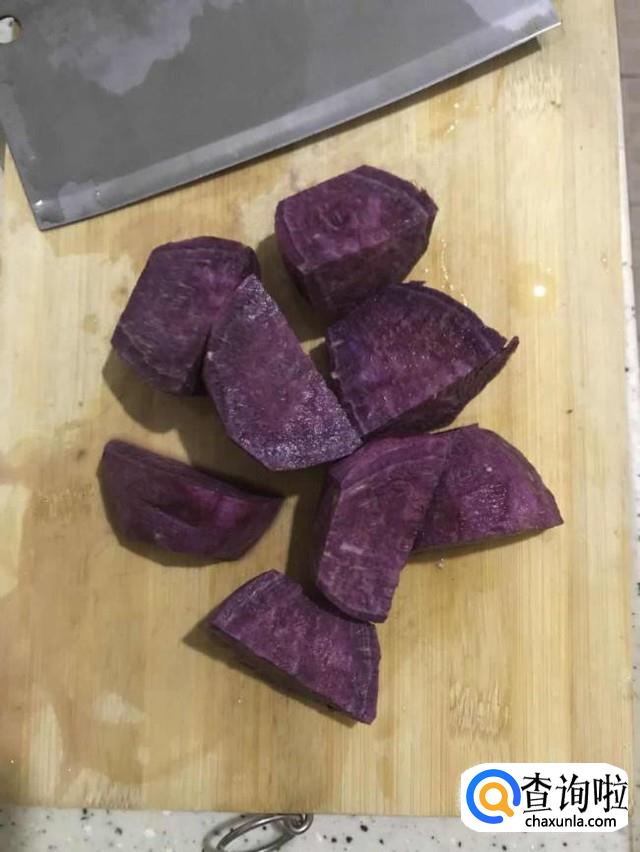 第二步:将紫薯洗净,切小块放入碗中并将它蒸烂。