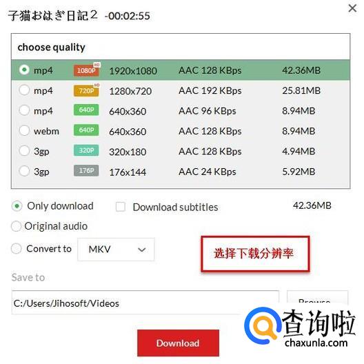 在对话框里面选择你要下载的视频分辨率,比如720P/1080P高清格式,或者是4K和8K超清分辨率;然后选择视频下载保存位置;