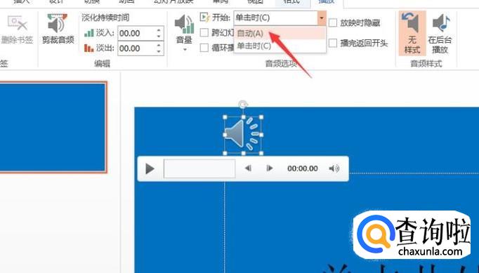 选择“自动” ,背景音乐会在你打开PPT时自动播放,选择“单击”,则在单击时才播放。