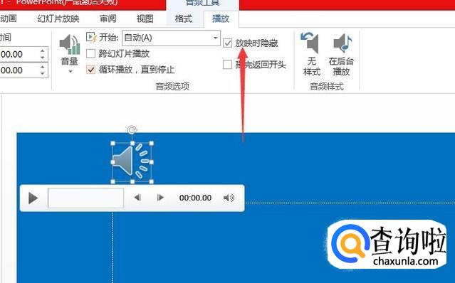 如果想要放映幻灯片时隐藏小喇叭,则选择“放映时隐藏”。