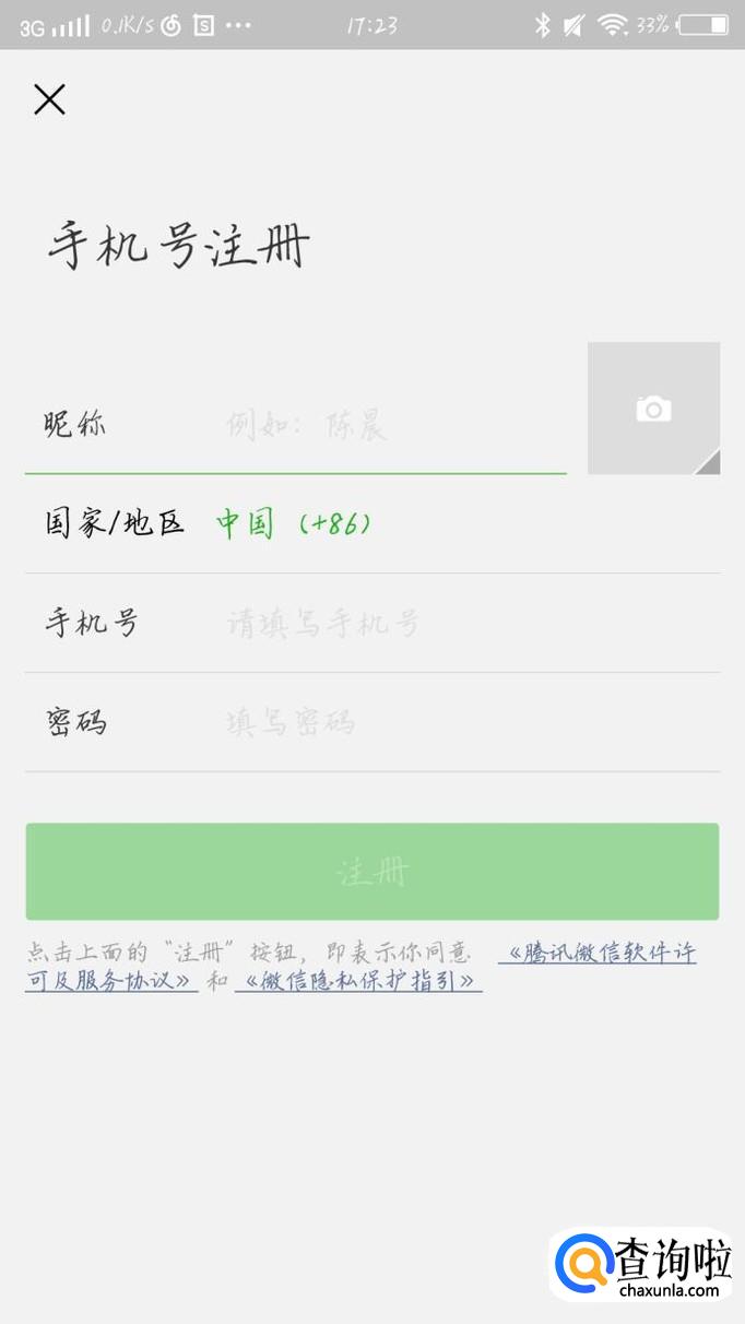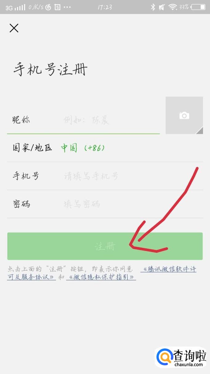 输入你的手机号,昵称,以及密码。点击“注册”选项,如图1箭头所示。这样就可以在注册一个微信号啦。