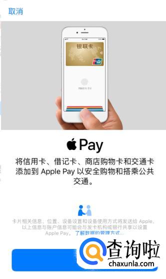首先,在设置中找到并打开Apple Pay界面,点击下方的继续按钮。
