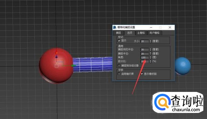 切换到顶视图(快捷键T)打开角度捕捉,右击图标打开“栅格个捕捉设置”窗口,在“选项”里将“角度”设置为120.