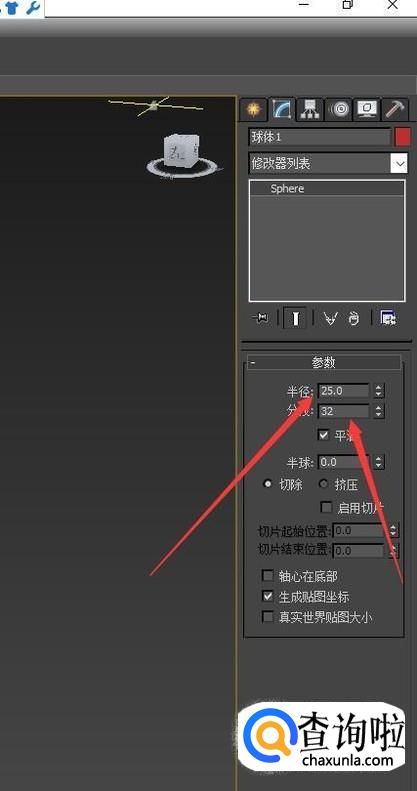 首先,我们点击透视图,按alt+w最大化显示,在透视图里面建立一个球体。并打开修改命令面板半径设置为25.0,分段为32,球体名称设置为球体1,颜色设置为红色。