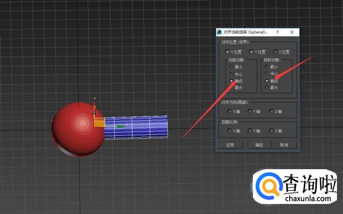 选中圆柱体,点击对齐工具,然后点击红色球体弹出“对齐当前选择”对话框。默认的XYZ位置全部勾选,“当前对象”和“目标对象”都选择轴点,点击确定。