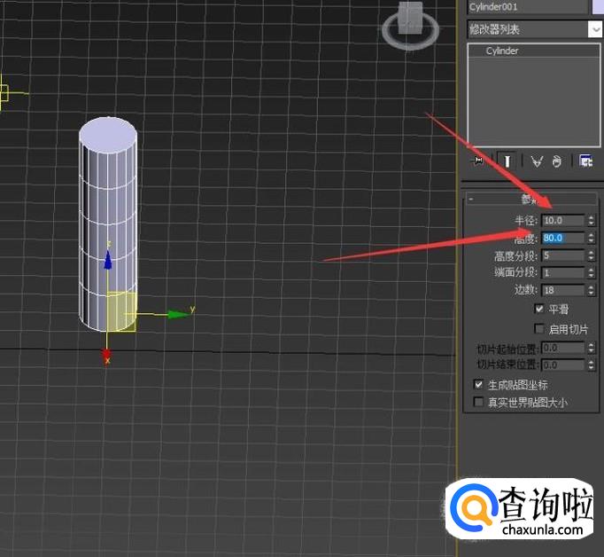 我们求换到前视图(快捷键F),建立一个圆柱体。在修改命令面板参数设置:半径为10.0高度为80.0,其余参数为默认值就可以。
