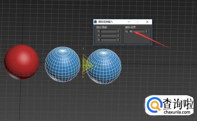 框选两个蓝色球体,打开缩放工具,在偏移:屏幕选项输入50.0