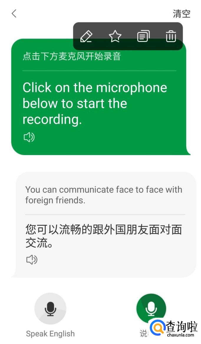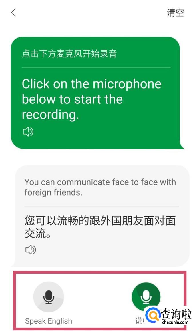 点击进入后,先点击底部的麦克风,然后对着手机说话,手机会自动记录下你说的内容并进行翻译,如图所示。