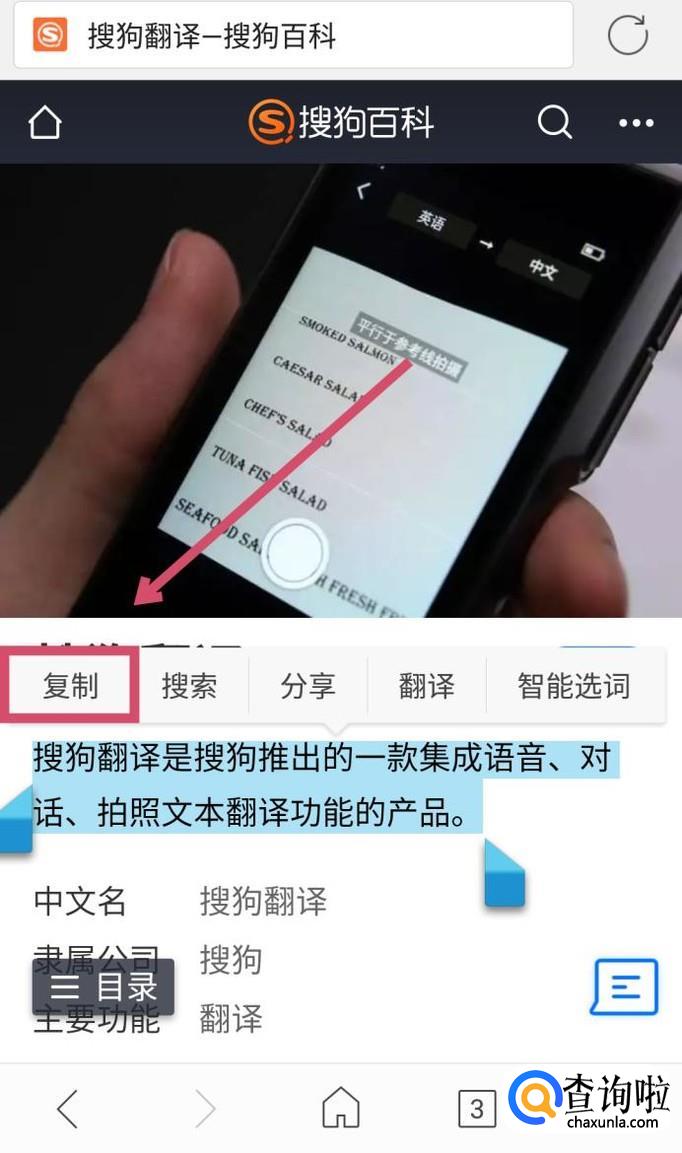 开启【跨软件查词】后,打开其它的软件,长按选择需要翻译的文字进行复制,稍等一会儿,界面上方就会弹出翻译结果了。