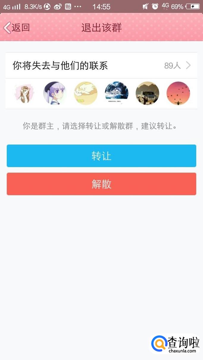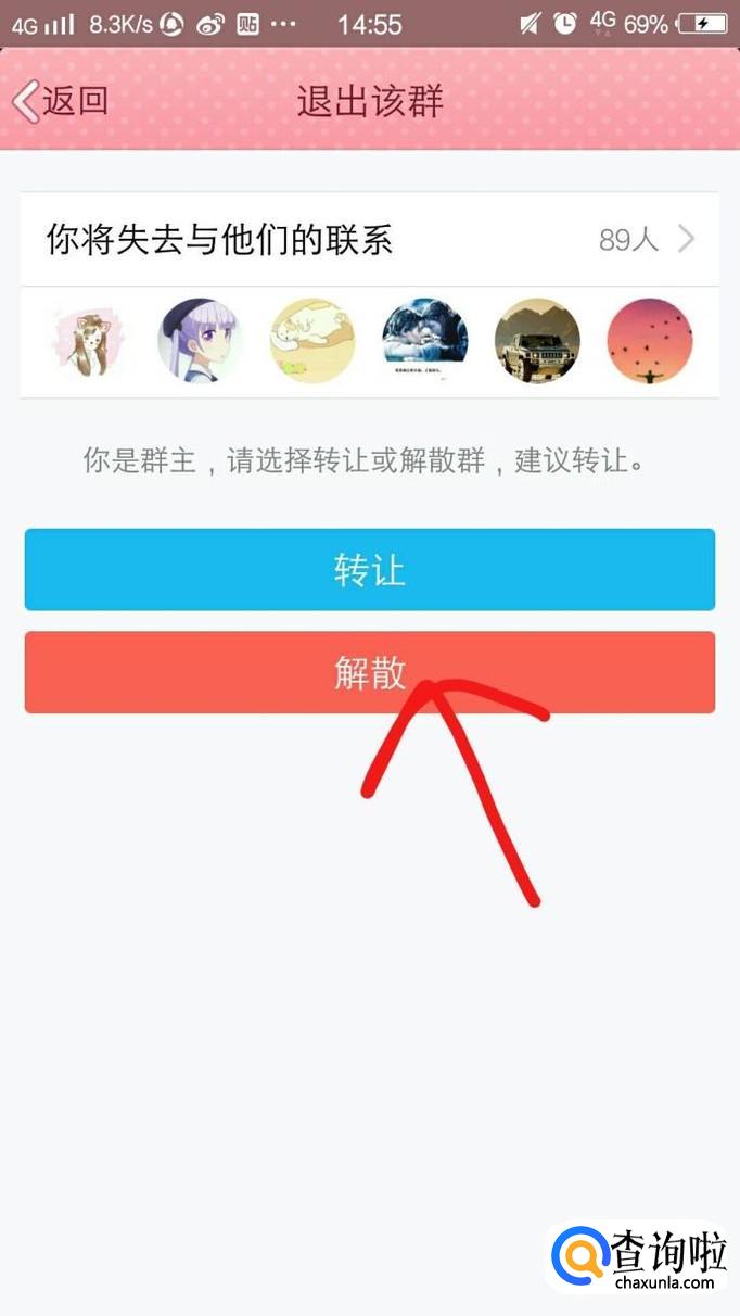 第七步,选择解散。想要转让群的话也是类似的步骤,只要在这里选择转让即可。