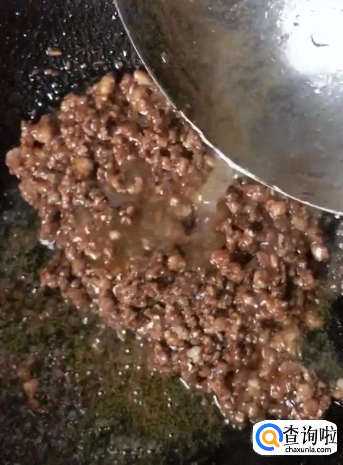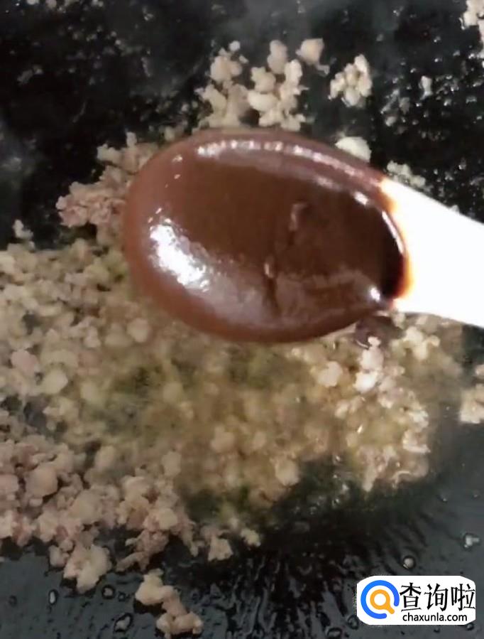 首先我们在锅中放入少许油,油热放入肉末,炒香以后放入一勺的甜面酱