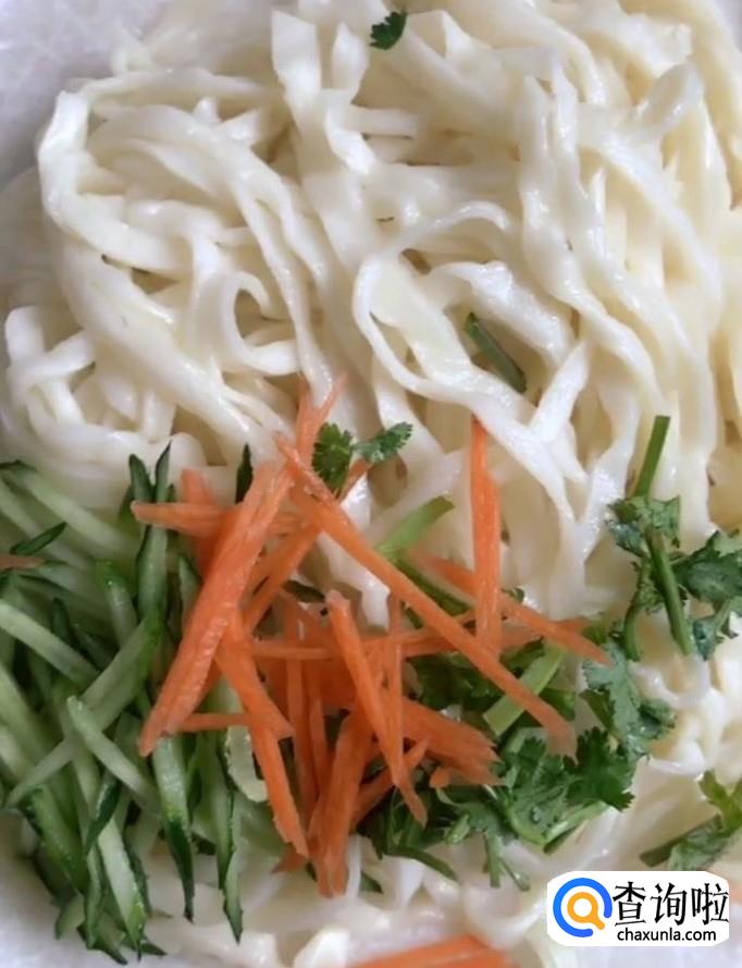 然后我们将手擀面放入热水锅中煮熟,捞出过凉放入盘中,放上一些黄瓜丝,胡萝卜丝,香菜作为点缀