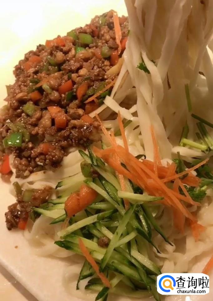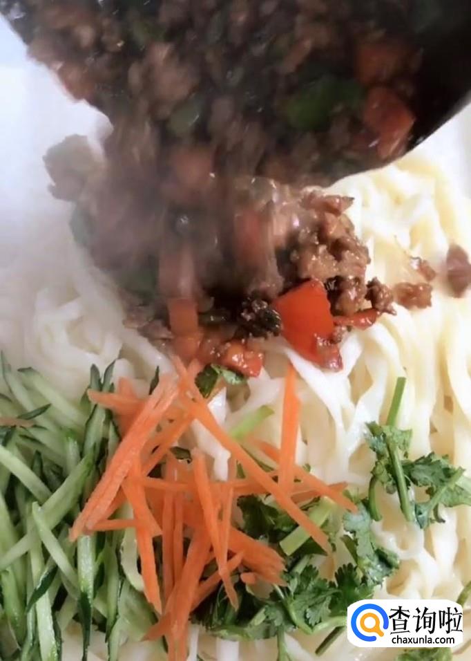 肉末,甜面酱,黄豆酱,清水,鸡精,白糖,老抽,辣椒,葱,黄瓜,香菜,胡萝卜,手擀面