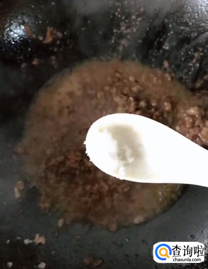 然后我们加入适量的鸡精,白糖,老抽翻炒均匀
