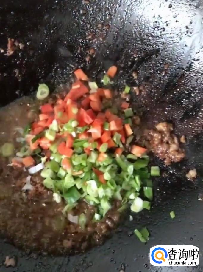 接着我们将切好的辣椒与葱花放入锅中继续翻炒,翻炒均匀以后关火备用