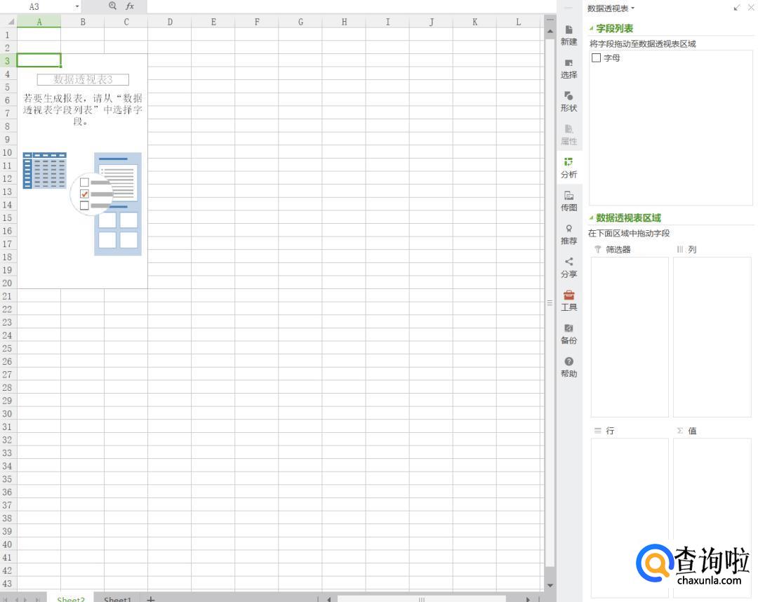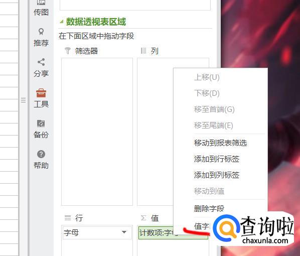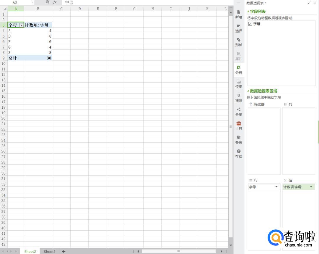 用鼠标单击任何一个单元格。然后把右边数据透视表的“字母”分别拖到“行”和“值”两个框中去。