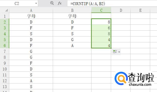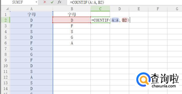 然后在C2单元格输入“=COUNTIF(A:A,B2)”。然后将公式下拉就得到了B列不重复数据在A列分别出现的次数。