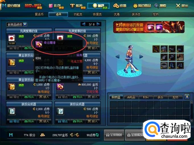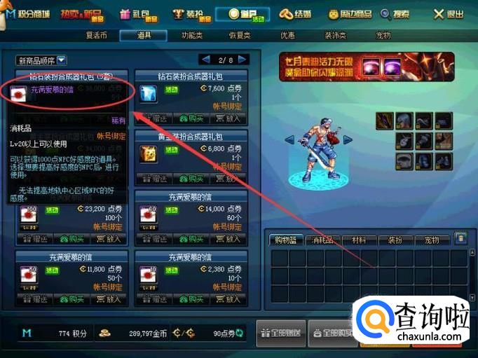 另一种方法就是在商城中直接购买盒子打开了,这就需要花费代币券了。我们打开商城,找到充满爱慕的信并购买,即可获得同等数量的魔盒以及幸运魔锤。