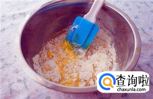 加上一点玉米粉,不用太多的,再加上筛过的面粉,一点点泡打粉,然后搅拌均匀。