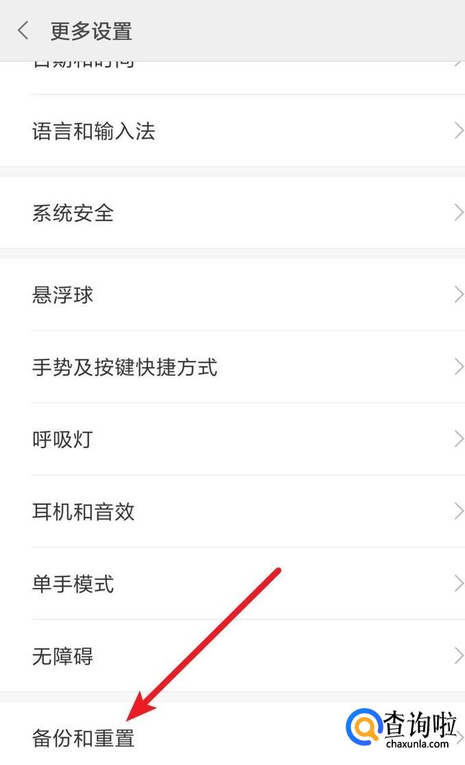 在更多设置页面,找到‘备份和重置’,点击进入。