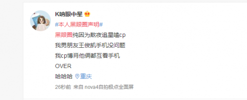 随着此处的分手事件的爆出,不少网友调侃起了自己的黑眼圈,并发搞笑声明证明自己的黑眼圈与夜间“运动”无关。