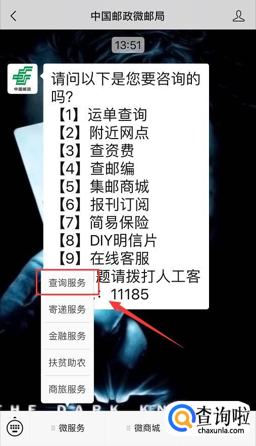 选择进入【查询服务】,也可以输入公众号给出的功能相应编号根据提示进行查询;